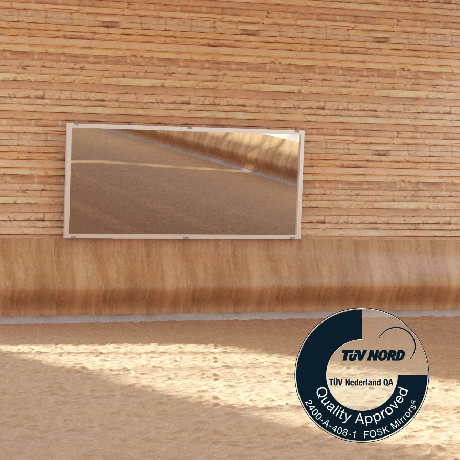 FOSK Mirrors lever verschillende kwaliteiten spiegels, zodat wij elke wens kunnen vervullen. Wij presenteren met trots de FOSK SuperSafe spiegels, deze spiegel is door TÜV-gecertificeerd. Onze persoonlijke nummer 1 keuze in manege en dressuur spiegels