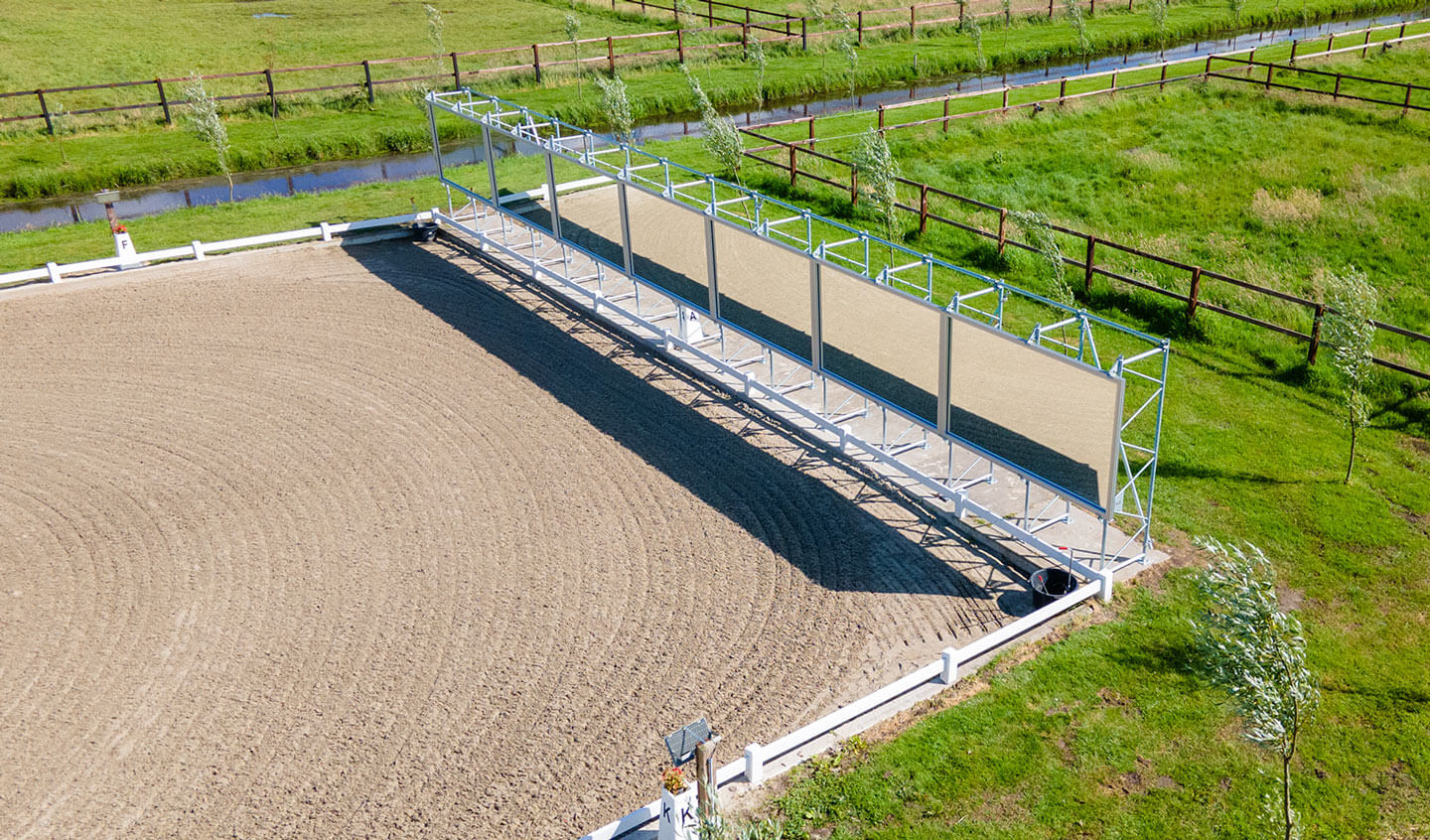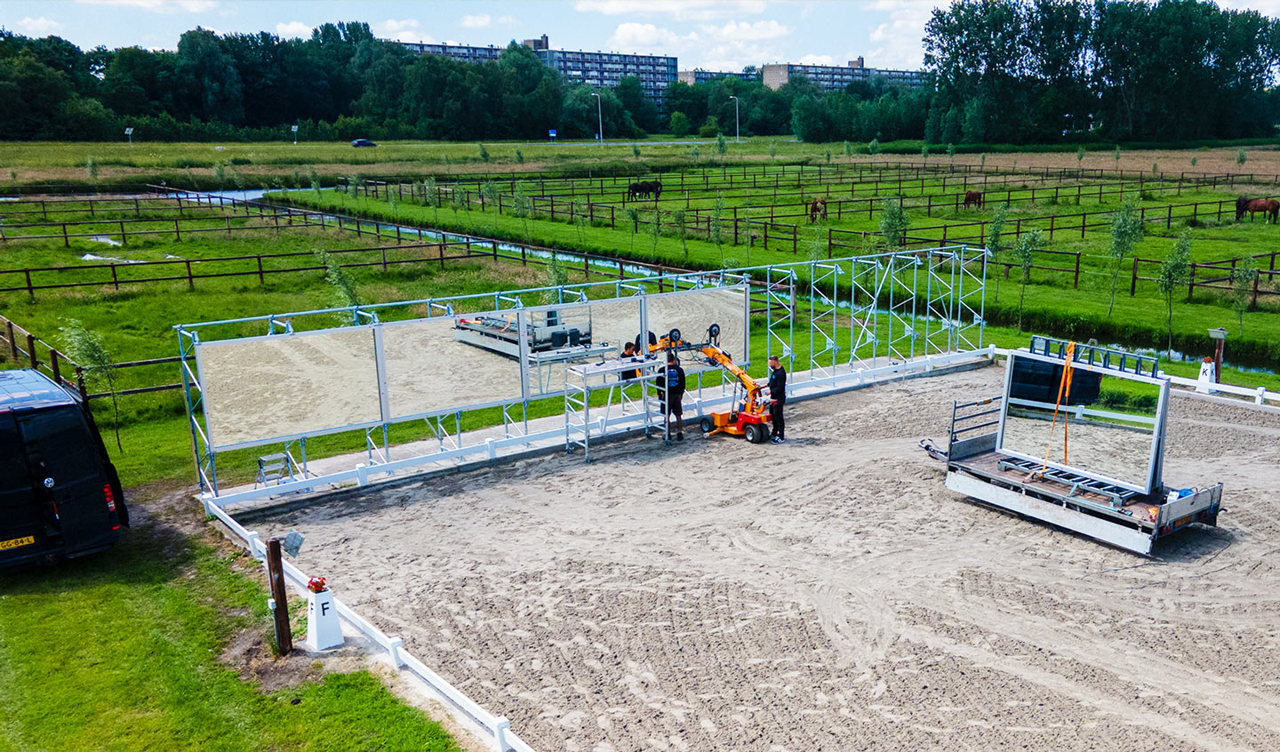Wat voor spiegel zoekt u? Wij kunnen manegespiegels leveren in elke maat. Of u nu een kleinere spiegel zoekt voor op de hoek van de bak, of een volledige spiegelwand voor de korte of lange zijde, u vindt hem bij ons. Elke spiegel bouwen we op uit een of meerdere spiegeldelen met een hoogte van 1,70 meter. Deze spiegeldelen plaatsen we in een aluminium profiel, dat wordt gemonteerd op een geschikte constructie. Deze constructie is afgestemd op de omstandigheden rond uw binnenbak of buitenbak.