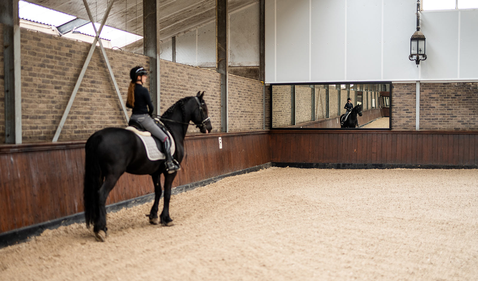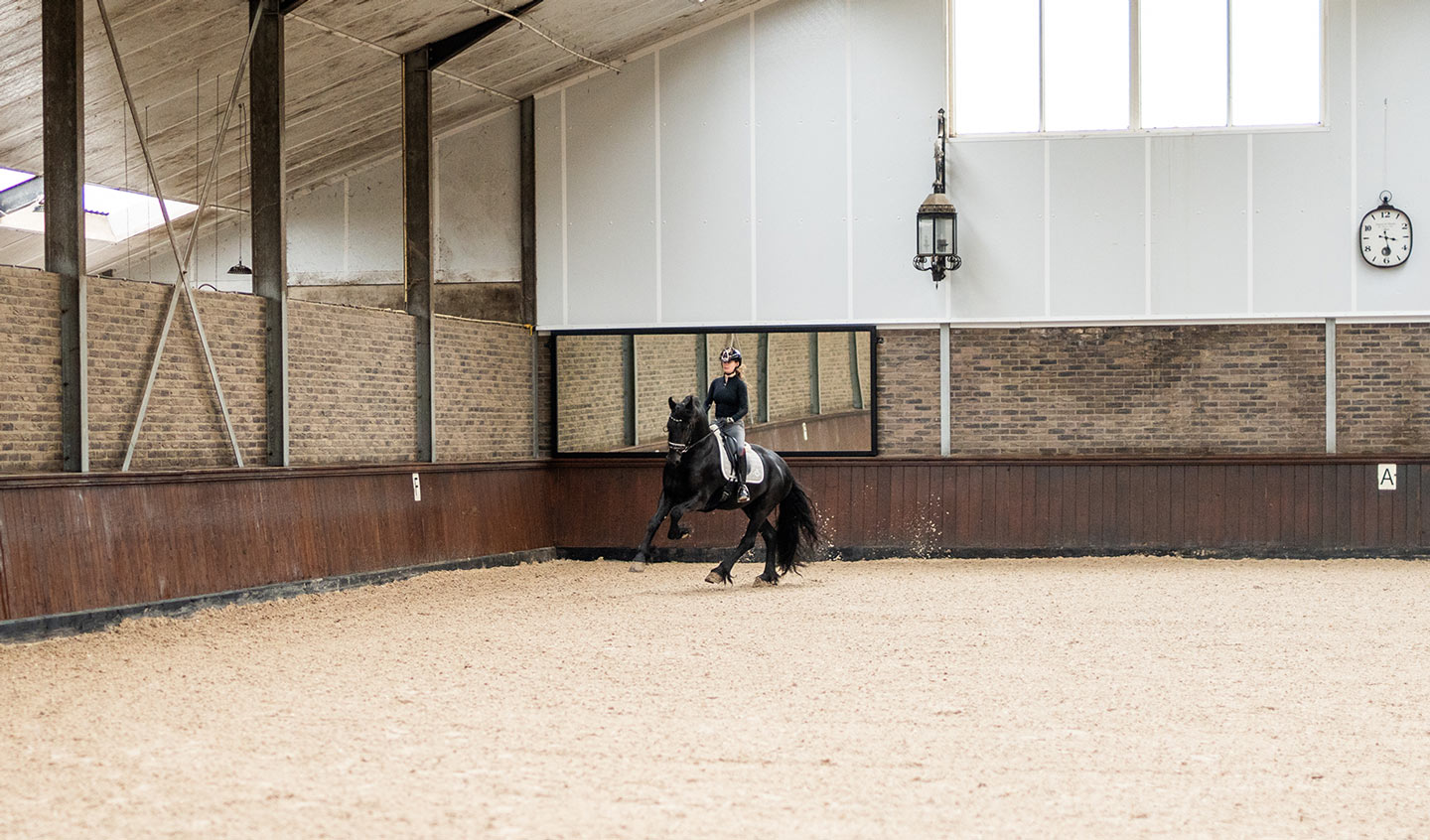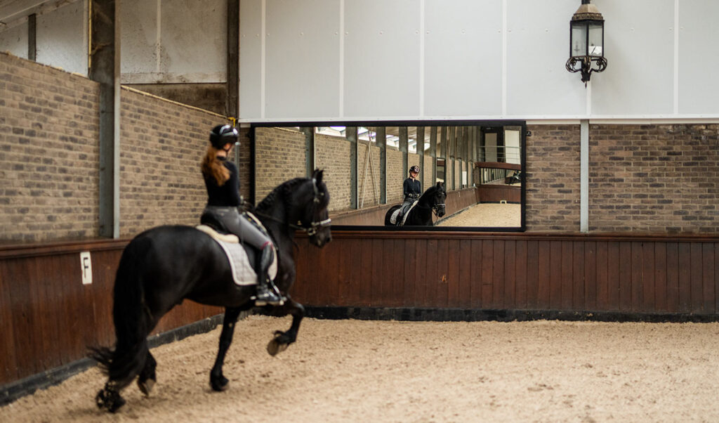 Voor deze binnenbak in Vijfhuizen realiseerden wij een EasyFix manegespiegel die volledig op maat is gemaakt voor de bestaande situatie. De klant zocht een strakke spiegeloplossing die perfect aansluit op de gemetselde achterwand en visueel volledig opgaat in de hal.
