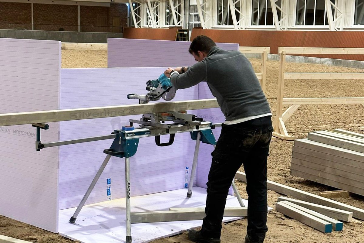 De uitdaging zat in de bestaande situatie. Door een grote glaspartij in de gevel was er geen dragende ondergrond beschikbaar voor een standaard montage. Daarom ontwikkelden wij een oplossing waarbij over de volledige lengte van de spiegelwand een houten draagconstructie vóór de gevel is geplaatst. Hiervoor gebruikten we gevingerlast hout, dat extra vormvast is en ook bij wisselende temperaturen strak blijft.